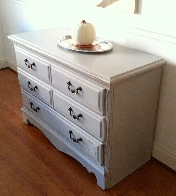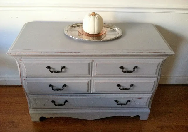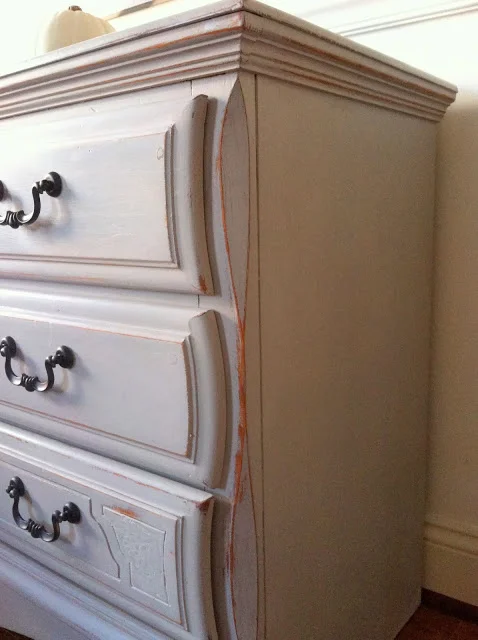 I refinished this piece in the classic color, Paris Grey, by Annie Sloan Chalk Paint. It is a favorite, hands down. You simply cannot go wrong with a soft grey, and as soft grey's go, Paris Grey beats em' all, (and I've used enough to make an informed opinion). Since this piece has soft curves and lines and I chose an equally soft color, I wanted to contrast the softness just a bit with some mild distressing and black hardware, (I simply sprayed the original hardware in flat black by Rustoleum, my go-to spray paint for hardware).