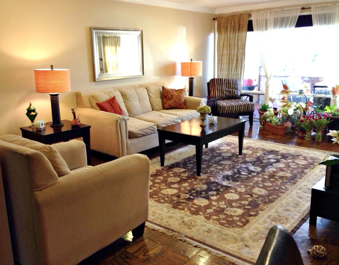 "My client wanted to update her living room as her existing furniture was not comfortable. She desired new sofas and chairs (especially a grey colored sofa), and wanted to keep her existing mirror, side tables, coffee table, and beautiful rug."