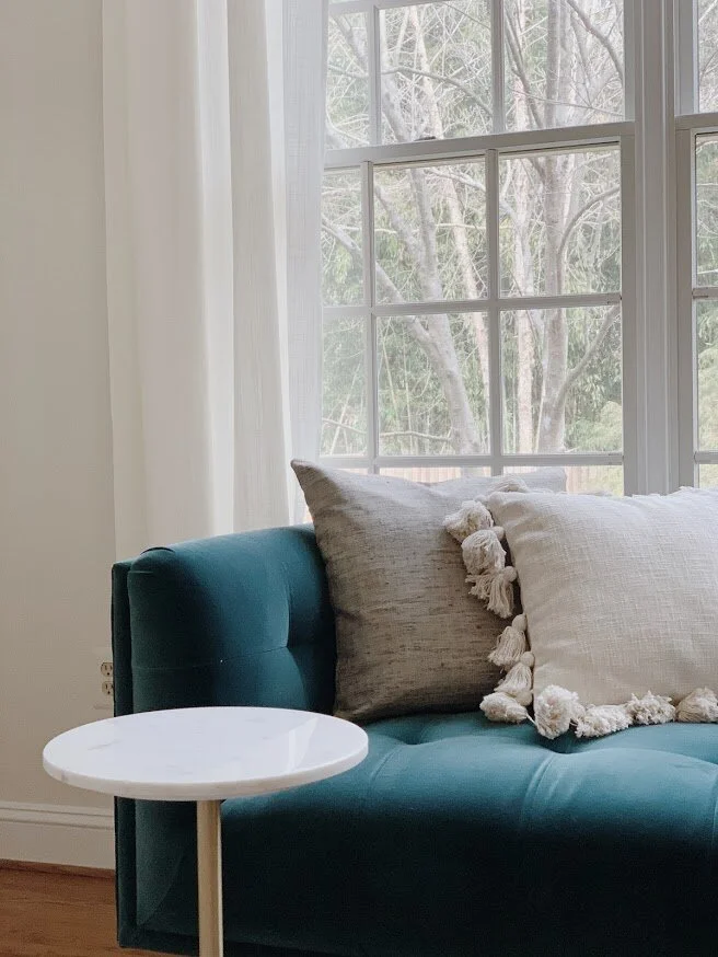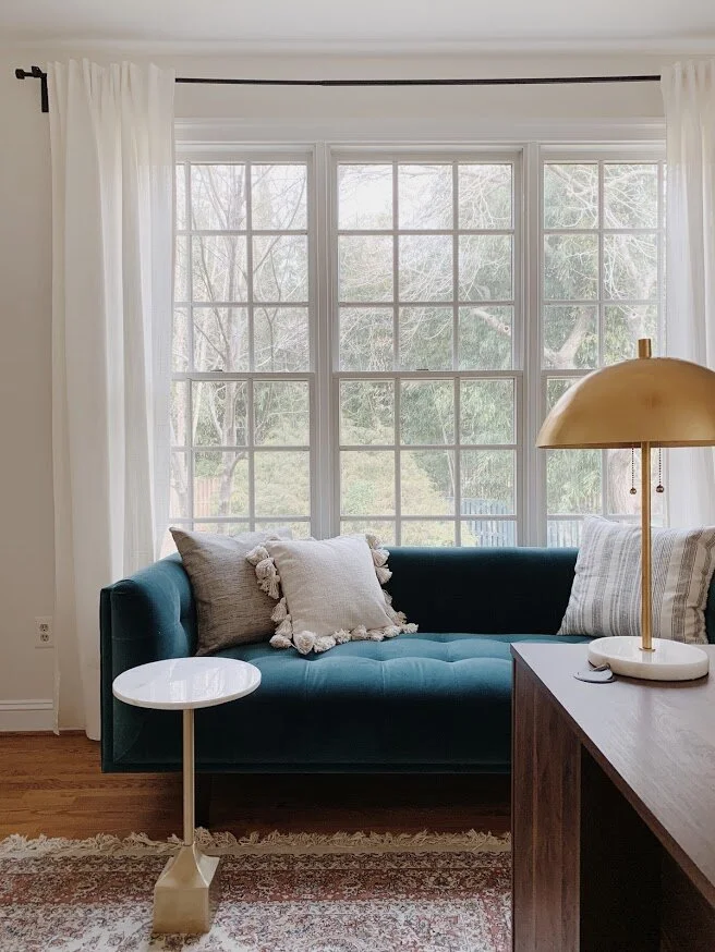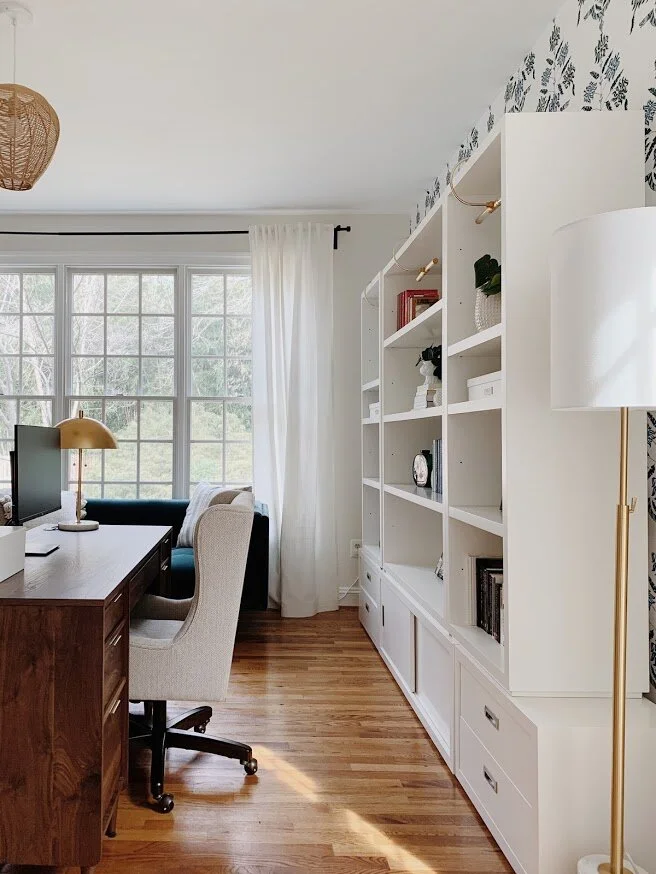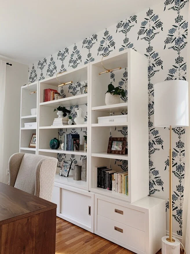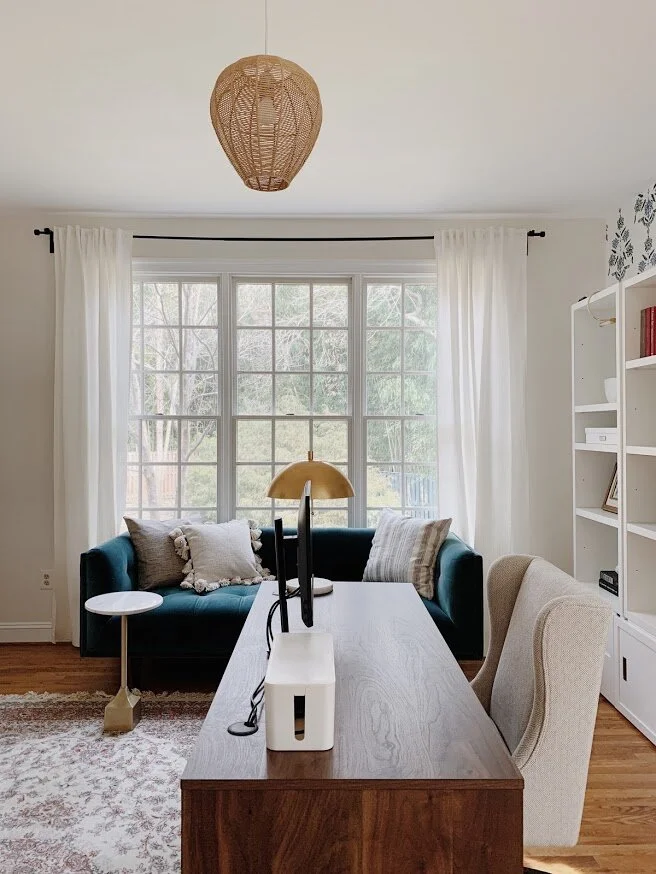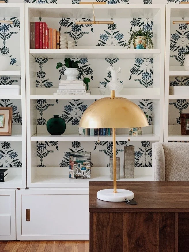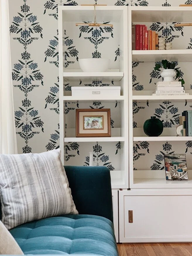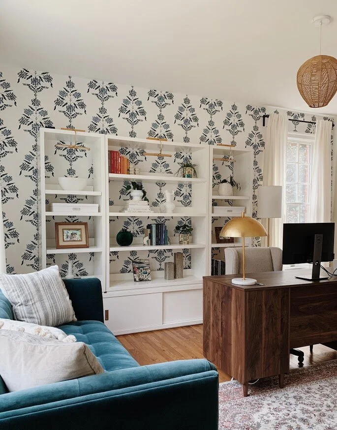 A background guaranteed to impress during Zoom meetings! A space all to herself, this room defines work from home in every sense. A vibrant, yet edgy, wallpaper layered with open back shelves styled with precious photos, heirlooms and a collection of milk glass. Floating the desk was the only sensible option to allow for flow and optimal fun both behind and in front. Because space and budget allowed, I added a peacock blue velvet sofa to maximize every opportunity to step away from the computer.